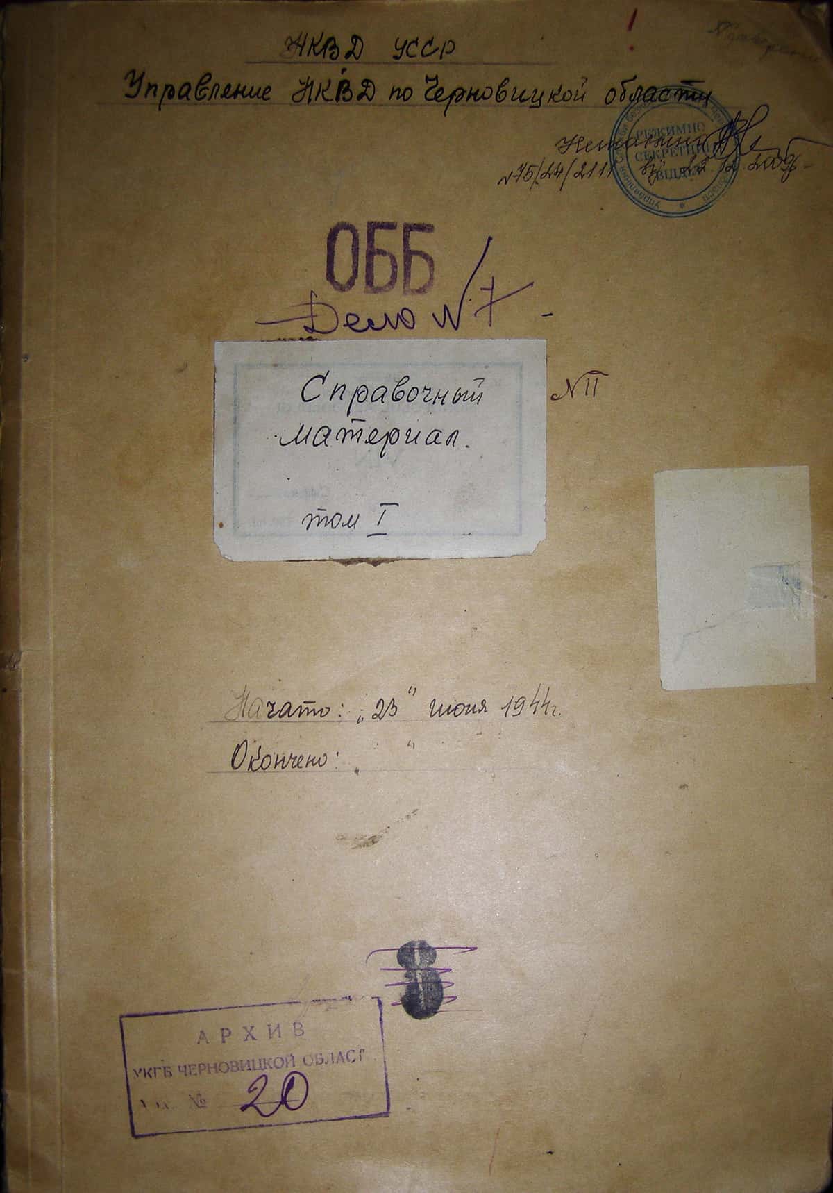 НКВД УССР. Управление НКВД по Черновицкой области. ОББ. Дело №7. Справочный материал. Начато 23 июня 1944 г. // ГДА СБУ, Чернівці. Фонд ОББ. Справа 20. 31 аркуш.