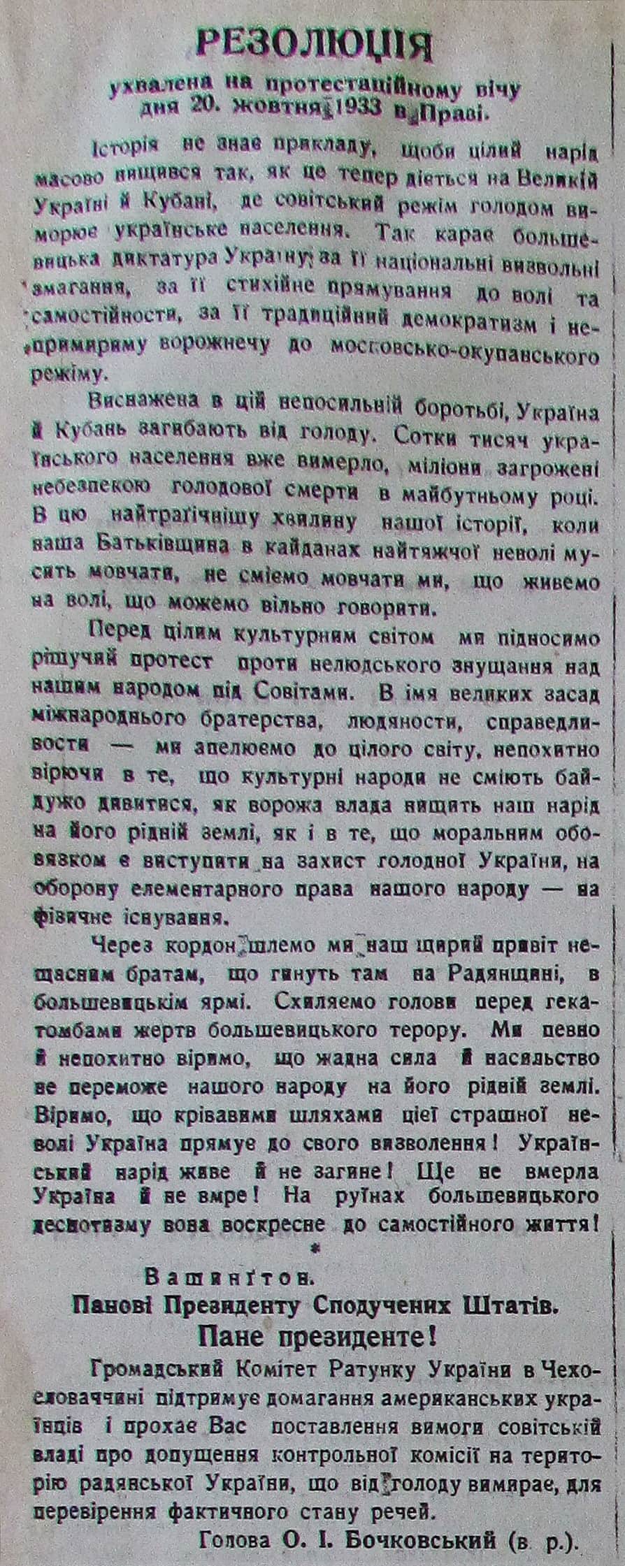 Резолюція протестного Віче, яке відбулося 20 жовтня 1933 року в Празі, проти винищення радянською владою українського населення. А також заклик до Президента США поставити вимогу радянській владі щодо допуску контрольної комісії на територію радянської України для перевірки реального стану справ із Голодом.