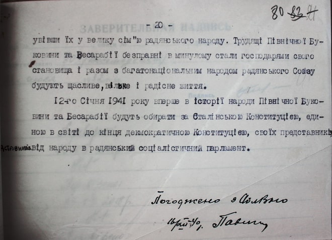 [і далі про пригнічення трудових мас на Буковині, про щасливий час визволення 28 червня 1940 року від гніту румунських бояр, про робітників, які разом з багатонаціональним народом радянського Союзу будують щасливе, вільне і радісне життя та про майбутню участь буковинців у виборах 12 січня 1941 року «за Сталінською Конституцією, єдиною в світі до кінця демократичною Конституцією», своїх представників в «радянський соціалістичний парламент»].