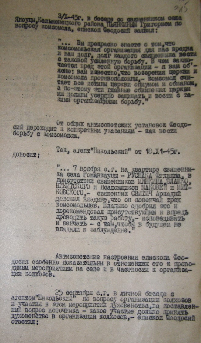 Епископ Феодосий также обставлен агентурой и активно разрабатывается. Непосредственную его разработку ведут агенты «Никольский» и «Лектор», характеристики на которых посланы во 2 Управление НКГБ УССР за № 2/3428 от 28.6-45 г.