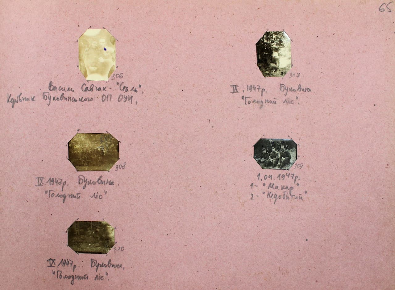 Остання сторінка фотоальбому. Розміщені фото № 307-311. На фото: "Сталь", "Макар", "Недобитий", а також фото невідомих повстанців за 1947 рік.