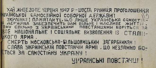 Український Народе! Вже п'ятий рік від знаменної дати кривавишся ти в нерівних змагах з оскаженілими наїзниками. Сьогодні сталінський протинародний режим – злиднями, засланнями, тюрмами, розстрілами і найрізноманітнішими засобами терору намагається перетворити Тебе в народ рабів, а згодом допровадити до цілковитого знищення.